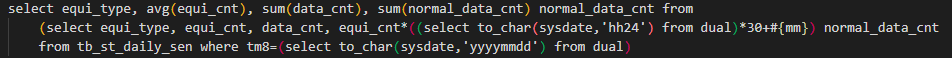 ERROR jdbc.sqltiming - 1. PreparedStatement.execute() FAILED! select equi_type, avg(equi_cnt), sum(data_cnt), sum(normal_data_cnt) normal_data_cnt from (select equi_type, equi_cnt, data_cnt, equi_cnt*((select to_char(sysdate,'hh24') from dual)*30+'15') normal_data_cnt from tb_st_daily_sen where tm8=(select to_char(sysdate,'yyyymmdd') from dual)
