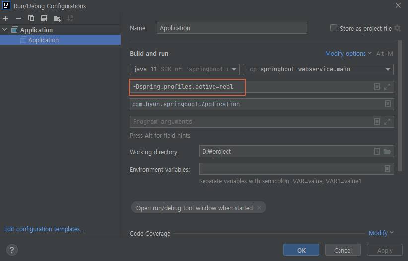 -Dspring.profiles.active='profile이름' 입력