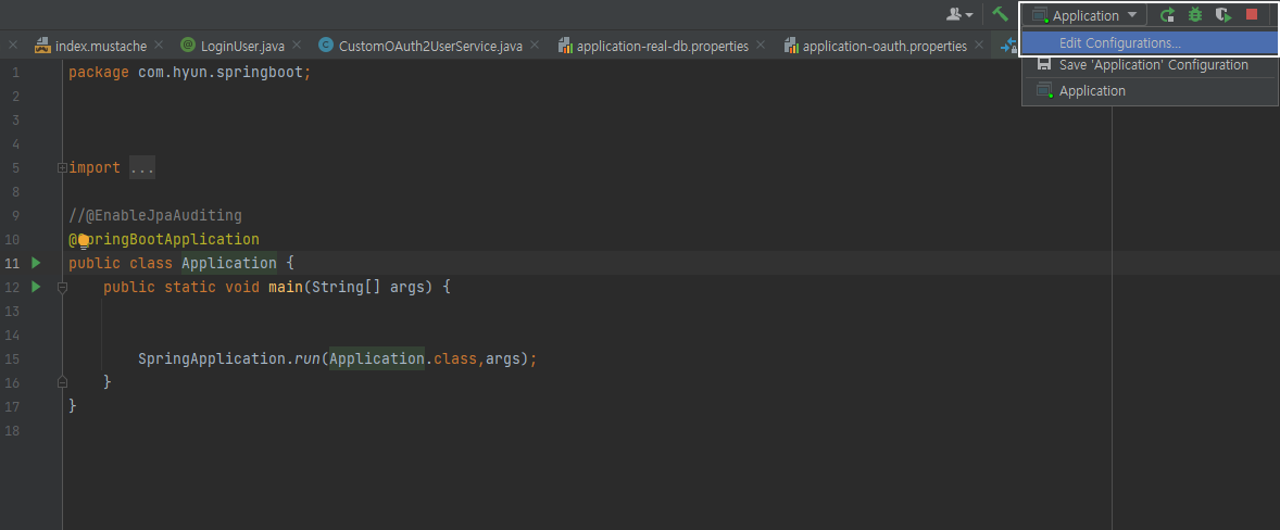 1. 오른쪽 상단 Application > Edit Configurations