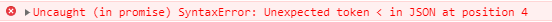 Unexpected token < in JSON : 대상을 JSON으로 파싱 중 < 를 발견, 즉 대상이 제대로 된 JSON 형식이 아니란 소리
