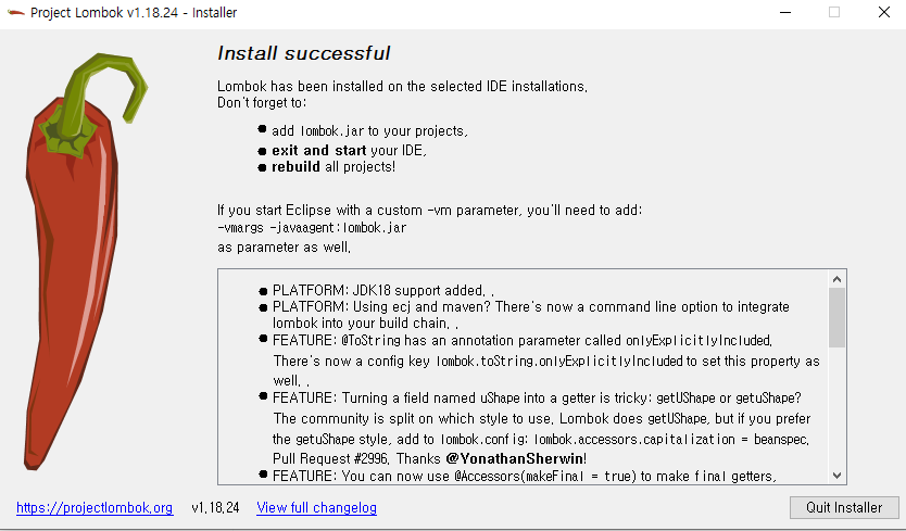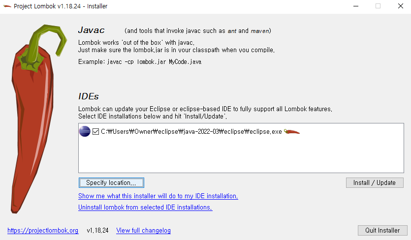 Installer에서는 lombok을 설치 혹은 업데이트 할 수 있는 IDE를 자동으로 찾아준다.