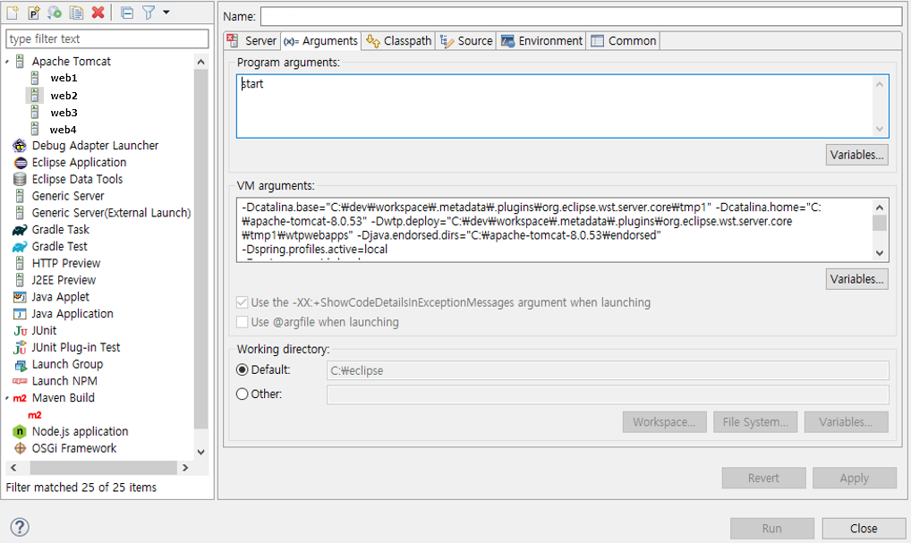 왼쪽의 [Apache tomcat] 에서 맞는 서버가 선택되어 있는지 확인하고 Arguments도 올바르게 들어갔는지 확인.
