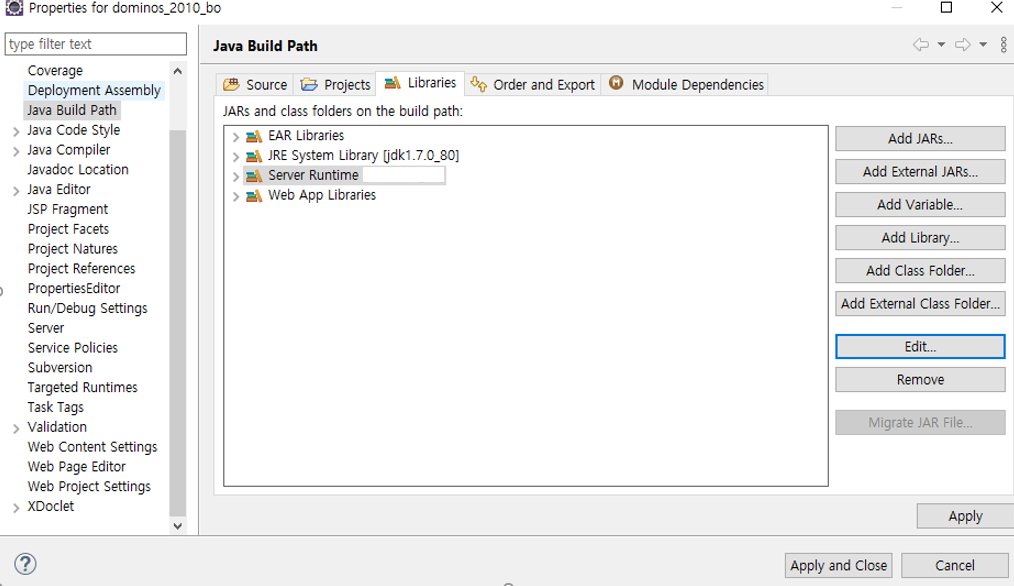 [Libraries] 에서 [JDK]가 잘 들어가 있는지 보고 [Server Runtime]도 확인. 나는 Server Runtime에 문제가 있어서 에러가 났던것임.