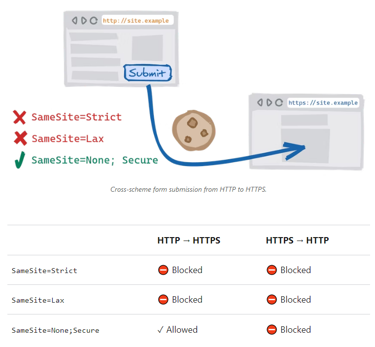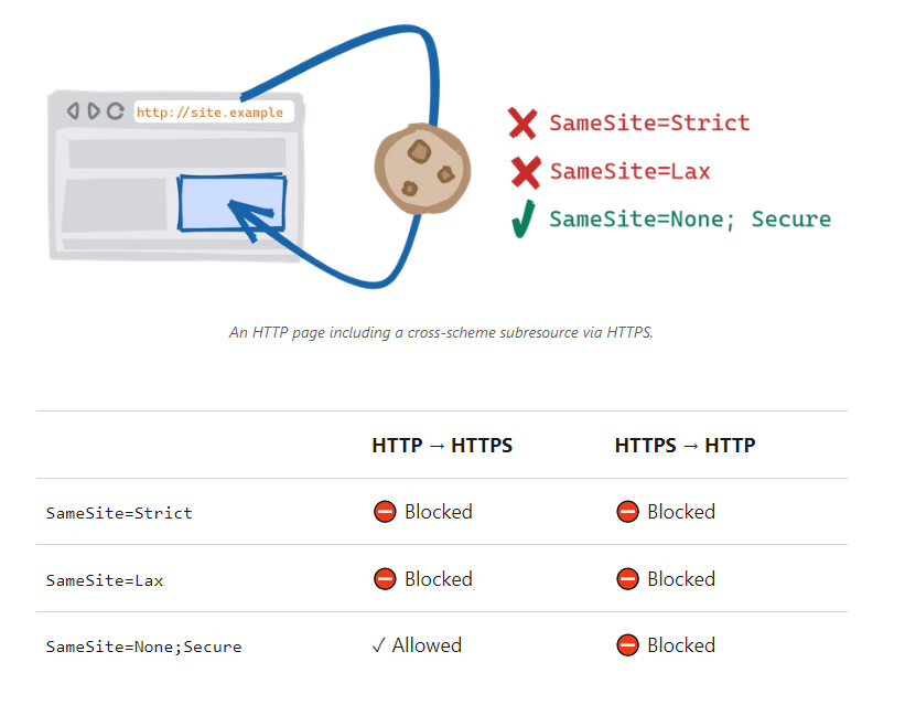 아래의 교차 스킴 유형에 따라 쿠키 전송을 위한 SameSite 속성값이 다름..