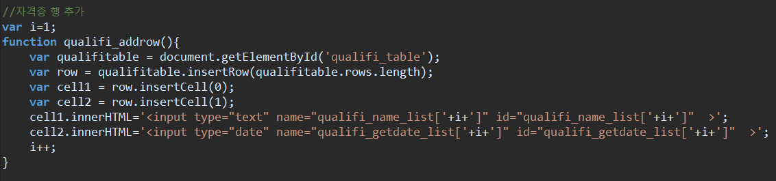 innerHTML로 행에 내용 추가.