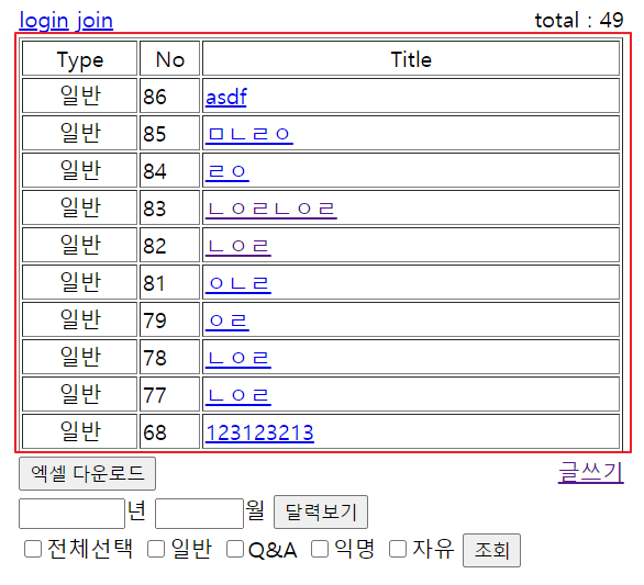일반/Q&A/익명/자유 중 게시글 타입(전체선택/일반/Q&A/익명/자유)을 check하여 조회하면