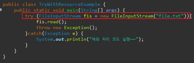 • 조건 : 리소스 객체는 java.lang.QutoCloseable 인터페이스를 구현하고 있어야 함