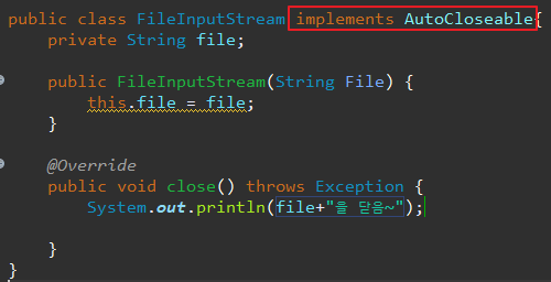 - 조건 : 리소스 객체는 java.lang.QutoCloseable 인터페이스를 구현하고 있어야 함