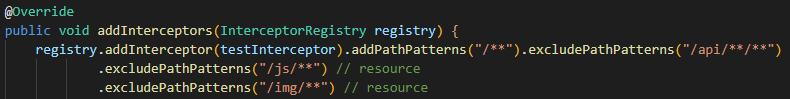 excludePathPatterns : 인터셉터를 제외할 url 패턴 등록