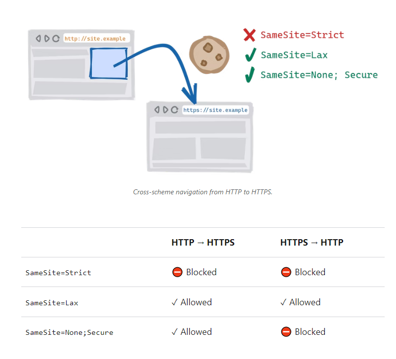 아래의 교차 스킴 유형에 따라 쿠키 전송을 위한 SameSite 속성값이 다름..