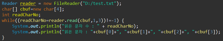 입력 스트림으로부터 len개의 문자만큼 읽고 매개값으로 주어진 문자배열 cbuf[off]부터 len개까지 저장한다.